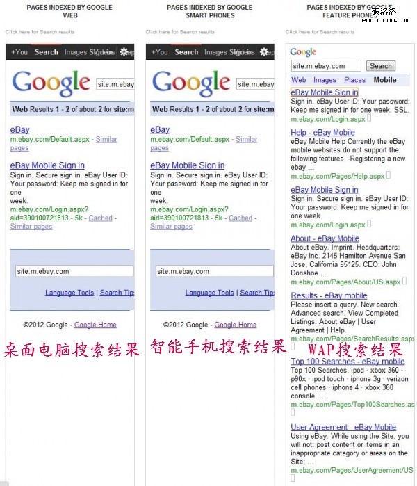 接下來筆者將舉一個更加明顯的例子,如下圖所示,圖中未eBay的移動站點在桌面電腦、智能手機及非智能手機上的收錄情況。