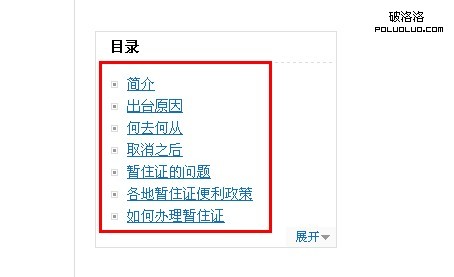 上圖中我們可以看到是一條關於“暫住證”的百科詞條,內容涉及的范圍著實夠廣的,涉及到暫住證的來源、政策、如何辦理等問題。如果我們不使用目錄,直接所有的內容放在一起,當一個訪客想尋找如何辦理暫住證的信息的時候,想必這一位訪客很難耐心的閱讀到文章的末尾,發現你的內容價值。