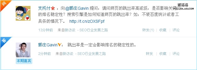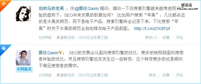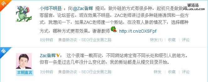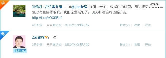 陳凱從事SEO周邊工作,之前有幸拜讀過zac寫的《seo實戰密碼》感到寫的東西很全面很詳細,對於我們這種seo新人來說很有幫助,所以一直對zac很關注,今天下午4點的新浪《SEO行業發展之路-微訪談》,邀請的嘉賓有SEO業界的大拿Zac昝輝,郭Gavin等人,所以這場盛宴自然是不能錯過的了,當然主要還是來學習知識的。通過關注這次微訪談感覺學習到了很多東西,專家大拿們給予的回答都很有分量,所以我把我所記錄的所想的三點感悟分享給大家。