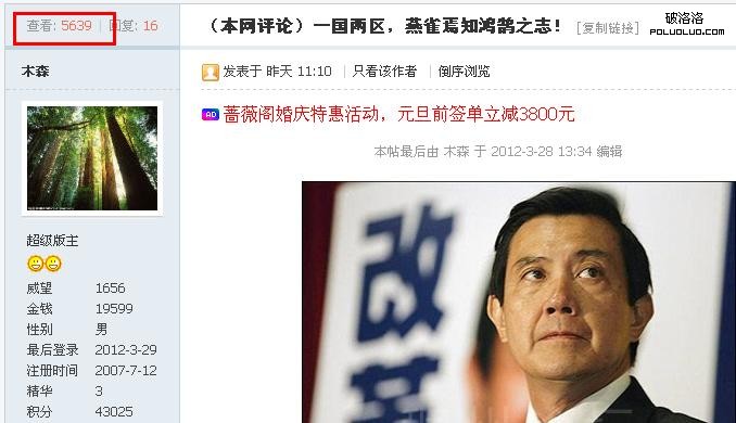 上圖是筆者的論壇最近做的一個測試,就是借助“馬英九一國兩區”這一事件來完成的。這個新聞目前並不是很新,但其真正影響巨大的是後續的新聞延燒效果。隨著越來越多的了解到這一新聞,網民就開始反思這一新聞所反映出來的問題。而筆者抓住網名的這一點,開始對這一網民感興趣的問題做出評論性的文章。結果通過這一事件,越來越多的訪客找到我們的站點。上圖中我們可以發現筆者發的這條信息在筆者寫本文的時候已經有五千多的流量,而這一系列的新聞也是筆者的站點的流量在這周有一個大的飛躍。如下圖所示。
