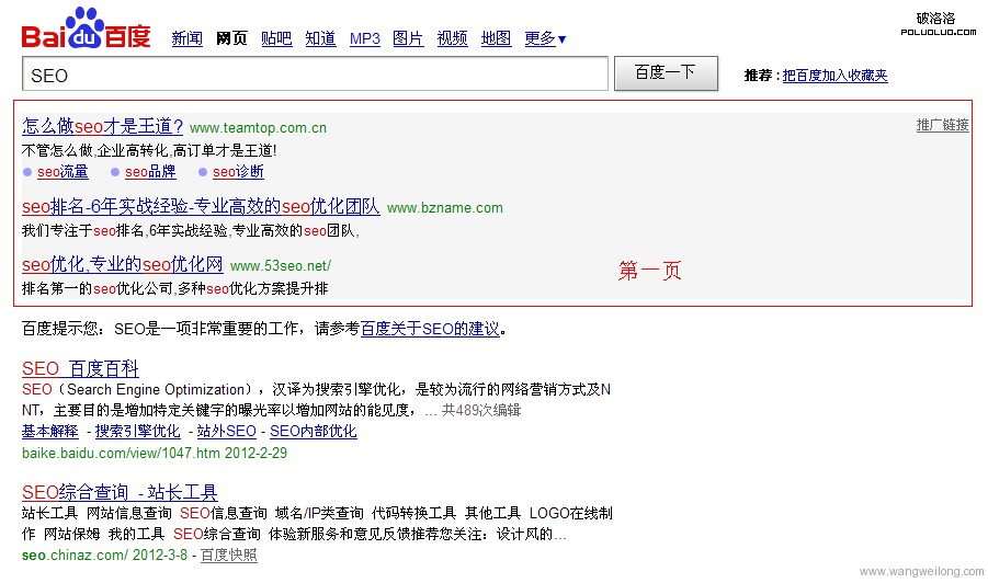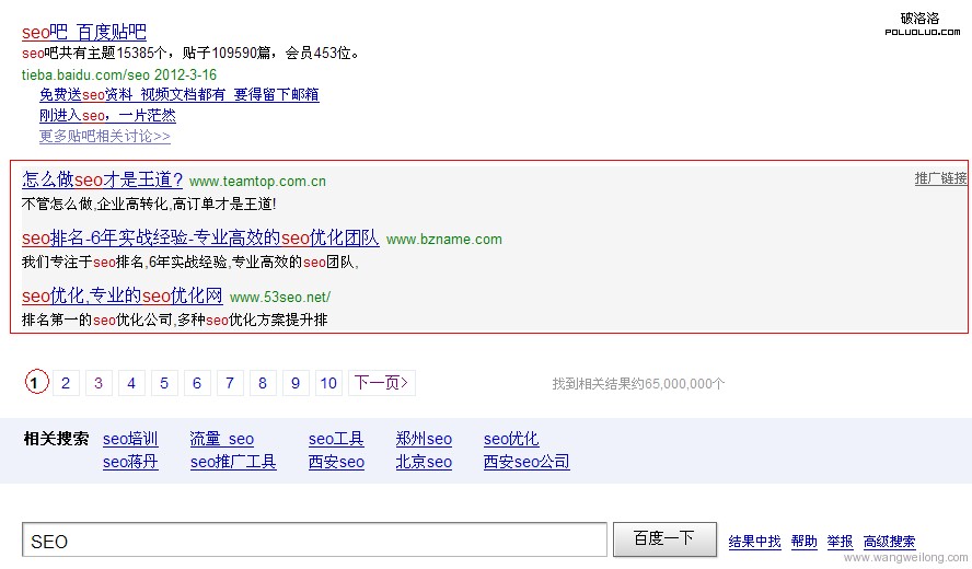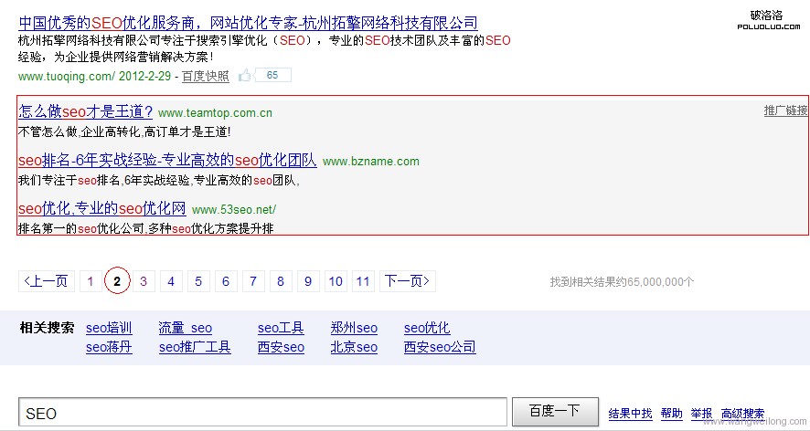 從上圖得知,百度競價以往只是第一頁存在推廣鏈接,而今發展至每一頁都有推廣鏈接,並且每一頁的推廣都是相同的鏈接。