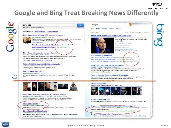 Optify公司CEO兼共同創始人布萊恩-戈夫曼(Brian Goffman )表示:“谷歌和必應都反映出他們對於重大新聞事件都是創造出不同的搜索結果頁面。谷歌會更加傾向於優先考慮權威的來源,而相比之下,必應會有更多最新的消息,但是這些並不一定是高權威的。