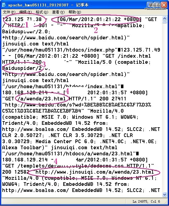 2是蜘蛛來訪日期時間(2012年3月6日1時21分22秒),3月7日的日志文件記錄的是從3月6日凌晨開始,至3月7日1時11分39秒整個時間段的n多次來訪記錄);