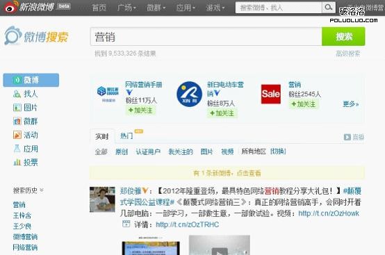 新浪微博搜索功能有,微博,找人,圖片,微群,活動,應用,投票。一般常用的是微博和找人這兩個功能,這兩個功能也是合並的。我們在微博搜索框裡搜索任何信息,一般都這樣顯示,頂部顯示三個微博,下方顯示微博內容,微博內容別為兩類,實時和熱門。