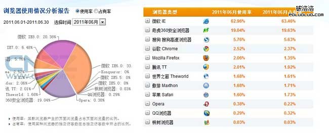 根據圖2中2011年6月份國內互聯網用戶浏覽器使用率和占有率,IE6占據了絕對主導的位置,再加之應用了IE內核的360浏覽器,更使得IE浏覽器幾乎覆蓋了80%的用戶使用率。而醫療SEM行業的目標訪客,也大多集中於30歲以上人群。所以我們就需要遵循以用戶為根本的設計原則,必須使我們的醫療站點兼容低版本的浏覽器。