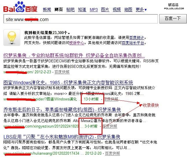 站點收錄是一個很頭疼的問題,我們在交換友鏈的時候,收錄的情況也是一個很大的指標,可惜有的站點就是那麼的不爭氣,收錄一直停在那邊,局限在一個瓶頸上。站點收錄多才能促進長尾關鍵詞的產生,如果只是靠單個關鍵詞,流量相對較低,而且單個關鍵詞的轉換率低於長尾關鍵詞的轉換率。當然有點要特別指出的,並不是說采集的就沒有收錄,而收錄多就一定有大的流量。如下圖筆者的站點所示。