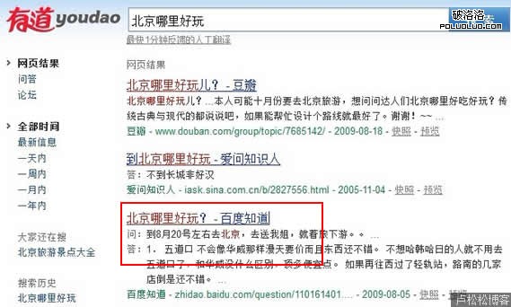 盡管通過soso搜“北京哪裡好玩”百度知道網址並沒有進入前三,但也排在第六位。由於篇幅所限,就不截圖了,有興趣的朋友可以用各大搜索引擎搜下。