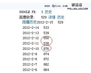 2012年2月11號,我查詢了我的一個網站收錄,發現收錄從昨天的876一下子被砍到538,再查詢一下目標關鍵詞排名,發現沒有一點變化,第二天,也就是12號,我又查詢了一下收錄,發現是550篇,但目標關鍵詞排名有了變化:四個目標關鍵詞全上調了,其中一個競爭度最大的目標關鍵詞升到了自然排名第一位,把一個我的老對手給擠下去了,我當時作出了這樣的分析:首先最近我的優化操作沒有大的波動,一如往常,所以這次關鍵詞排名的變化有百分之九十的可能,是和昨天的收錄銳減有關。但按常理來說,一個網站收錄被減少將近一半,這顯然是一種搜索引擎對網站懲罰的最初征兆,可既然是懲罰,搜索引擎又為什麼會把關鍵詞排名上調這麼多呢?下面是我對此事的分析。