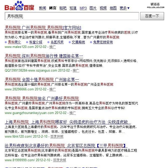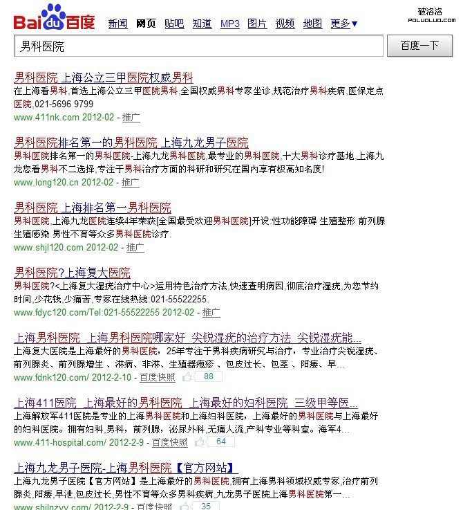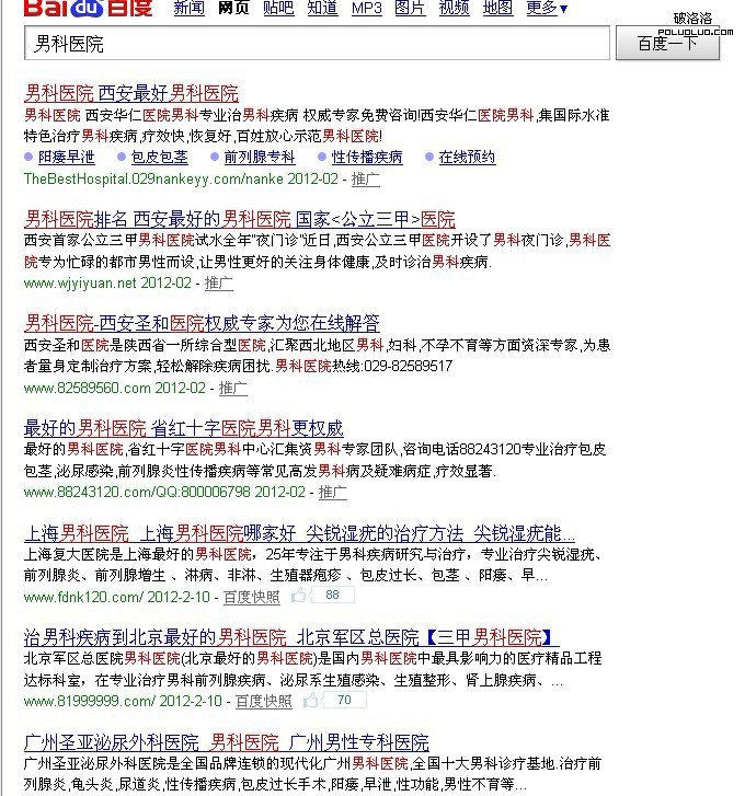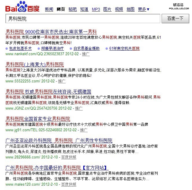 圖1-5分別是在天津、西安、江蘇、上海、廣州地區,關鍵詞“男科醫院”的首頁排名部分截圖。首先在這裡要聲明,本文的重點並非是要探究百度對於關鍵詞地域性差異的機制原理。這個現象是顯而易見的,這個現象也是眾所周知的,這個現象應該也是商業機密的,但這個現象同樣也是非常明顯的用戶體驗。針對醫療行業來說,用戶在所在地區(如果這個所在地區的IP地址是真實的前提)搜索“男科醫院”這個關鍵詞,搜索引擎不論通過何種方法來判定,用戶有可能想要獲知所在地區男科醫院的信息,那麼會優先把該地區最有可能相關的網站排名提前,讓用戶第一時間可以看到。筆者姑且就把這個現象稱之為“全國性關鍵詞地域性結果”好了。