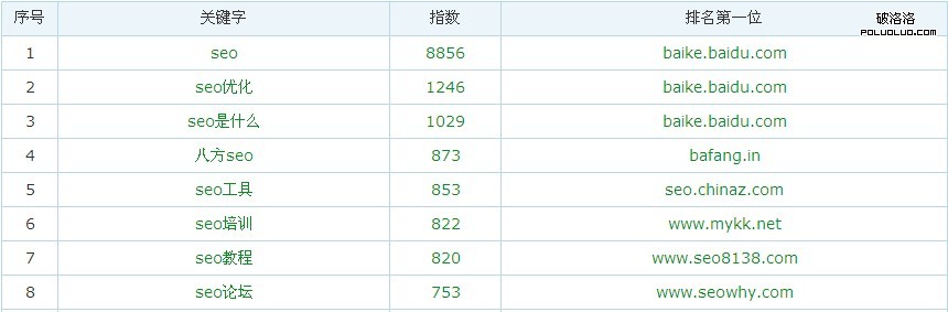 通過上面這張圖可以看到關鍵詞“seo”的指數達到8856,第二位“seo優化”指數1246,中間相差7000多,可見seo這個詞受歡迎度極高,搜索和競爭也會極大。我們分析,通過搜索關鍵詞,排在第一位的網站,圖中指數最高的前3個詞,排在第一位的網站都是baike.baidu.com。百科是百度旗下的產品,擁有的權重很高,這樣就會很難競爭,這樣的詞雖然搜索量大,關注度高,但對優化來說很難,我們可以選擇避過。