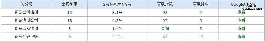 從這個圖上可以分析出來,青島注冊公司這個詞密度是4.3%,排名是第3。也就是說關鍵詞密度大,排名也就越來。再一方面就是關鍵詞出現的位置。一般來說,標題關鍵詞的位置越靠前,排名就越好。對於標題,描述,關鍵詞標簽這三方面來說,簡潔明朗是最基本的。例如 站長之家 - 中國站長站 CHINAZ.com | 我們致力於為中文網站提供動力! 這個標題就很簡潔明了,不超過30個字,也突出了網站的主題,大家可以好好的借鑒一下。描述和關鍵詞描述的寫法同樣如此,主題鮮明,簡單大方,這就是規范的寫法。