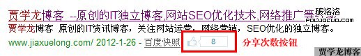在同一天給自己的幾個網站安裝了百度分享工具,自己點了幾下分享。其中一個站是第二天就在搜索結果裡面顯示喜歡人數,我的博客是兩三天之後才顯示,還有一個至今未顯示。綜合分析起來可能是和快照還有內容的更新有關。因為至今沒有顯示的站很長時間沒有更新文章了,不常更新原創內容,快照也來的慢,所以不顯示也就很正常了。