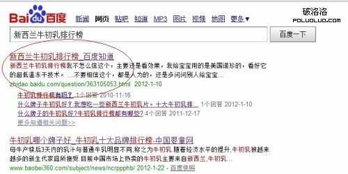 在相關搜索中,我認為“新西蘭牛初乳排行榜”這個長尾詞可能有流量(因為新西蘭的奶制品在國內很暢銷,估計很多人會搜索,這個根據自己關鍵詞來判斷),然後再對這個詞進行搜索,在搜索結果中找到“百度知道”的結果: