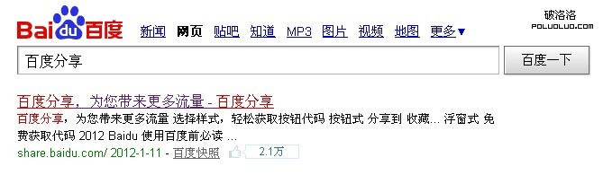 小編分析了差不多50個帶有“百度喜歡”小牌子的網站,80%的網站都有使用“百度分享”。也許百度就是以“百度分享”來效仿“GOOGLE+1”。只有點擊分享按鈕,分享了網站,等待快照更新就可以獲得。