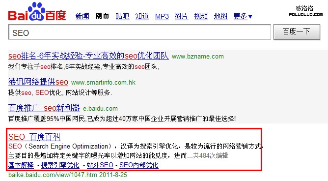作為百度旗下的一個重要的平台,相信大多數的優化人員對它都不會陌生。百度百科素有高排名高權重的美稱。我們也可以很明顯的看出百度對百度百科排名的“偏寵”。如下圖所示,作為SEO這個競爭這麼高的詞,排名第一的就是百度百科。筆者在谷歌上發現百度百科也可以排到第二。足見其在搜索引擎中的不凡的表現。那麼你是否了解百度百科?從百度百科上我們可以學到什麼優化的只是?筆者將在下文中分享幾個從百度百科上筆者看到的優化知識。