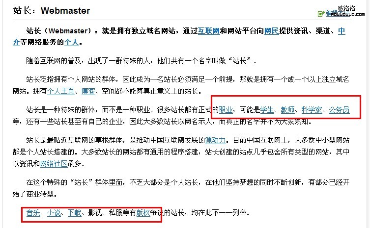 我們可以發現百度百科的另一特色就是,在百科中所有的相關的詞條之間都有通過錨文本互相鏈接。我們同樣以“站長”這個詞條為例,我們可以發現在小小的一個並不熱門的詞條之中就有二三十個內部的錨文本鏈接。而這一些錨文本是提高用戶友好體驗和增加搜索引擎蜘蛛爬行熱度的不二法門,而且通過這種方式構建的內鏈可以使訪客在站內駐留的時間更加的長,訪客將會有更加深入的訪問。