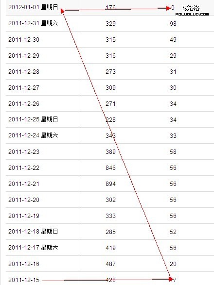 下圖看看筆者實驗的網站2個月的時間。一個月寫原創內容排名直線上升。一個月轉載復制內容網站排名直線下降到100名以外了。下圖的網站是11月10號正式上線。到今天為止差不多2個月.12月15號之前排名直線上升到第2頁。至從轉載復制內容之後排名直線下滑。到如今的沒有排名了。下降的速度相對外鏈來說。稍微慢一點。!