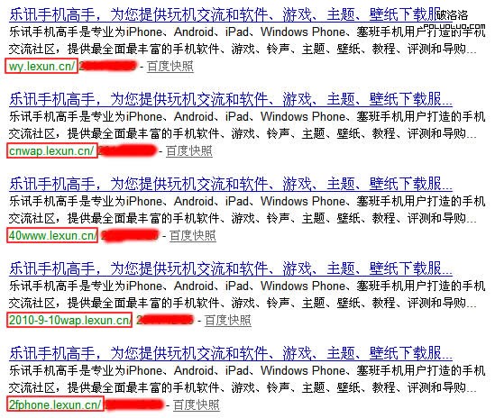 由於使用了泛解析,site:***.cn首頁的時候,會出現很多稀奇古怪的二級域名,這些域名可能是用戶使用後留下的痕跡被搜索引擎檢索並收錄下來,如下圖: