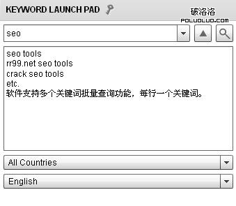 關鍵詞面板 KEYWORD LAUNCH PAD。輸入你要查詢的關鍵詞,軟件支持批量查詢,在下面的框裡輸入批量查詢的關鍵詞即可,每行一個關鍵詞。下面是查詢的國家,再下面是語言,這兩項根據自己的需要自己調整。