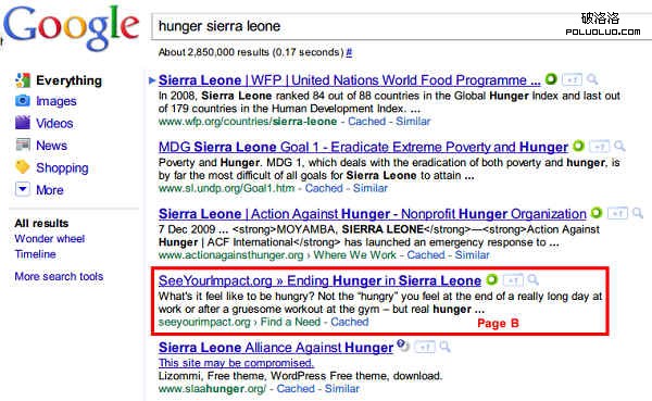 原圖中范例所使用的關鍵字並不恰當,所以我實際使用“hunger sierra leone”在Google.com中搜索,發現依舊是Page B獲得了比較好的名次。