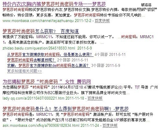 首先,為“夢芭莎時尚密碼”這個關鍵詞定制了一個權重相當高的欄目頁面作為登錄頁,優化到百度自然排名的第一位;同時,在站內站外發布相關資訊文章,搶占百度首頁。