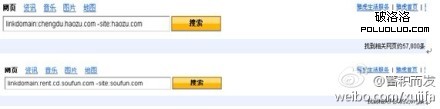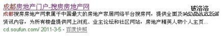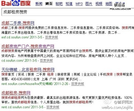 6、在百度搜索“成都租房搜房”關鍵詞時,網站rent.cd.soufun.com的標題與該關鍵詞匹配度最高,按照百度分詞的慣常原理推斷,理應排在前面,可事實是rent.cd.soufun.com竟然只排在第四位。由此可見,網站的權重確實很低。這可以解釋了,在同樣的條件下,為什麼像諸如“濟南租房“在rent.jn.soufun.com下排名很好,而”成都租房“在rent.cd.soufun.com卻排名很差。這跟網站權重有一定關系。