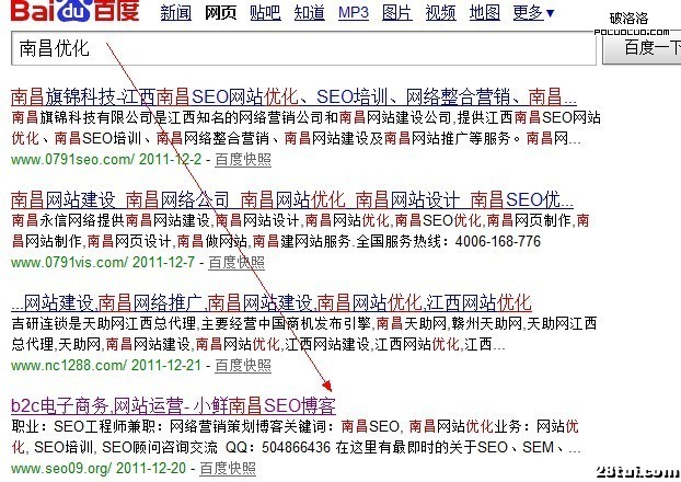 就這樣,就在第2個月的月初,天不負有心人,突然發現自己的網站的關鍵字終於百度第一,在這裡千萬別問,怎麼突然到百度第一,有什麼秘籍等這些。這些就是每天重復著內容為王,外鏈為皇的2個月堅持的功勞,接下來首頁上的3個關鍵字也全部到第一了,心裡那個喜悅無人怕是只有做SEO者所能體會到的。隨後的日子就開始接單所優化的網站等其它的的目標關鍵字都雙雙進入第一了。可能是難度不大,所以這一點突破還是簡單的。在這裡先截圖排名首頁的南昌優化這個關鍵字吧。由於工作的原因,網站的關鍵字排名就掉後了。