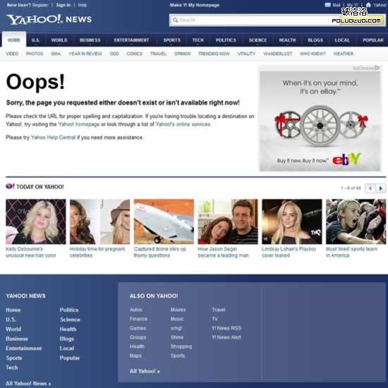 盡管內容很多,但最醒目的位置依然顯示錯誤信息,提示用戶,要訪問的頁面不存在。然後,上面加入導航,右邊放上廣告,下面再擠點圖文並茂的文章,這還不夠,最下面在仍點導航鏈接進去,用戶想不點都不行啊。