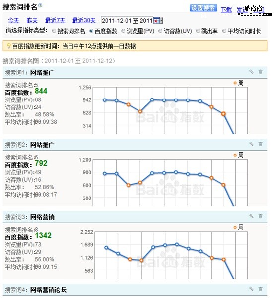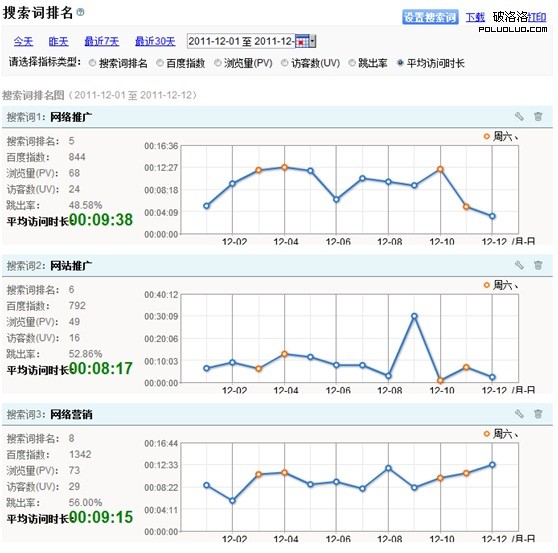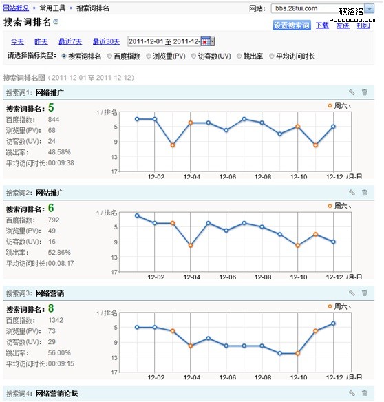 現在百度統計提供的權限是,可以最多同時關注10個搜索詞的排名情況。這個觀察數量應該已經能滿足大部分網站的需求。比如2網站最關注的其實也就是“網絡推廣”、“網絡營銷”、“網站推廣”這幾個詞的情況。通過上圖能一目了然的知道,這3個詞最近幾天的排名情況,是上升還是下降。
