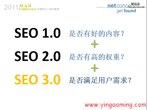 從上圖中,我們從渠總的一張PPT中可以清晰的看到seo 三個階段的時間分點,可能會有朋友說這個時間不准確,這點我覺得不重要,對於一個網絡現象來說,我認為更應該看到的時現象之後我們作為一個所謂的業內人能夠看得到什麼樣的解決方式或者辦法才是能夠解決這些問題的關鍵,不管是1.0,2.0還是現在開始的3.0,seoer在推廣中的地位,推廣在網絡營銷中的地位都是什麼樣的,一耳光seoer能否適應推廣的變化,推廣能否適應網絡營銷的變化,緊跟腳步甚至超前,這才是我們關注的地方。![]()