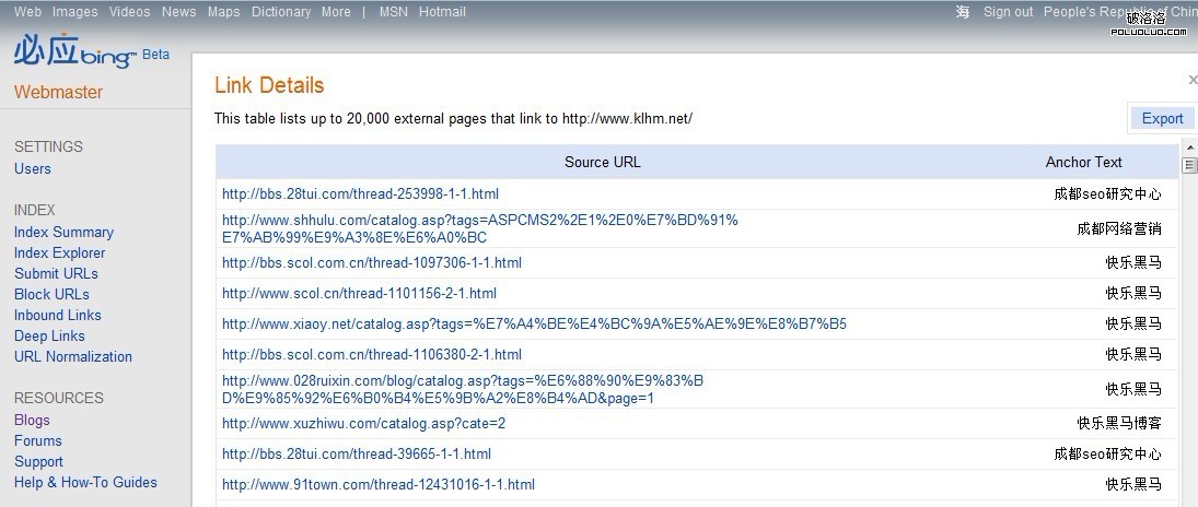 我在第一間加入了bing網站管理員工具體驗隊列中,我的幾個網站包括三個企業站兩個博客網站都加入了這個新興的bing站長分析平台。在bing站長工具眾多功能中,我們還是看到了雅虎功能的身影(外鏈查詢功能)。話不多說,直入主題。bing外鏈查詢功能 是超乎想象的強大,所以大家還是不用驚恐的查不到自己的外鏈了,這就是江海“驚”的地方。唯一遺憾就是只是你無法查詢到你競爭對手的有效外鏈而已,因為這個就是你的google analytics,是你的cnzz數據後台,明白的請打1。能夠准確提供查詢自己網站有效外鏈的工具以及讓人欣慰了。