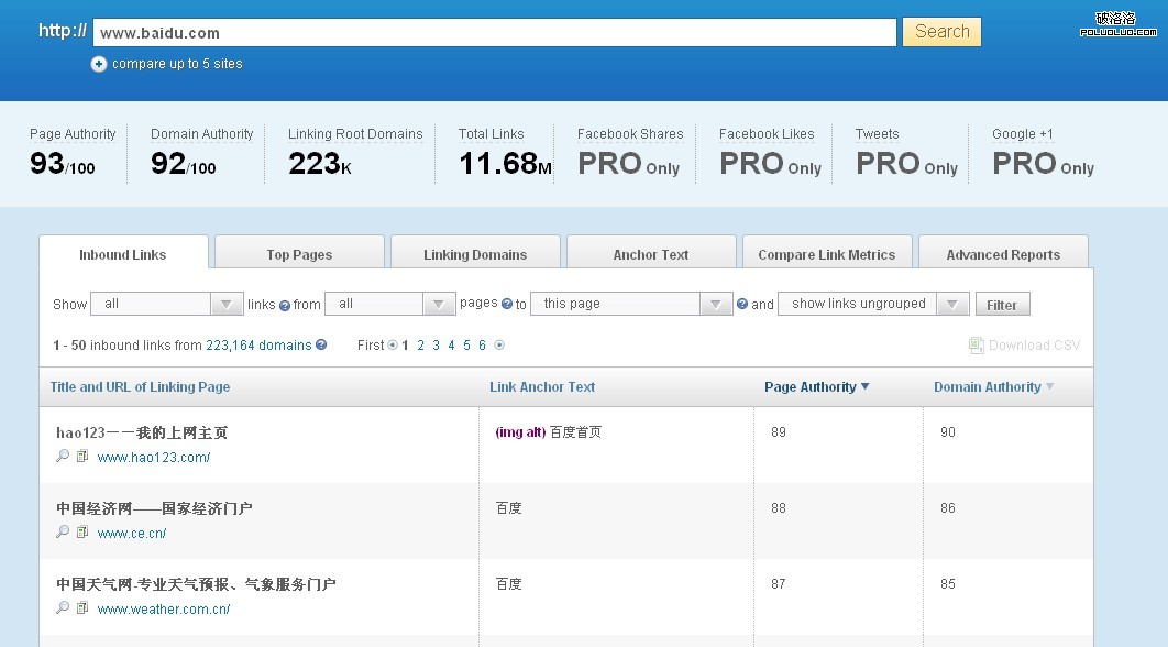 首先:打開opensiteexplorer.org,輸入網址以百度為例: