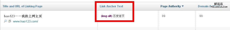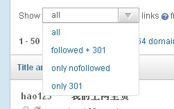 第一個選項卡——inbound links,外部鏈接,就是我們重點要用的了。選擇之後我們就能看到在什麼網站做的外鏈,外鏈的錨文字,外鏈網站的權重值,外鏈網站域名的權重值,而且還會顯示外鏈的顯示方式,如圖,百度在hao123的鏈接是圖片方式。除了全部的鏈接,我們還能單獨看301轉向的外鏈、nofllow的外鏈、301+nofllow的外鏈等等。
