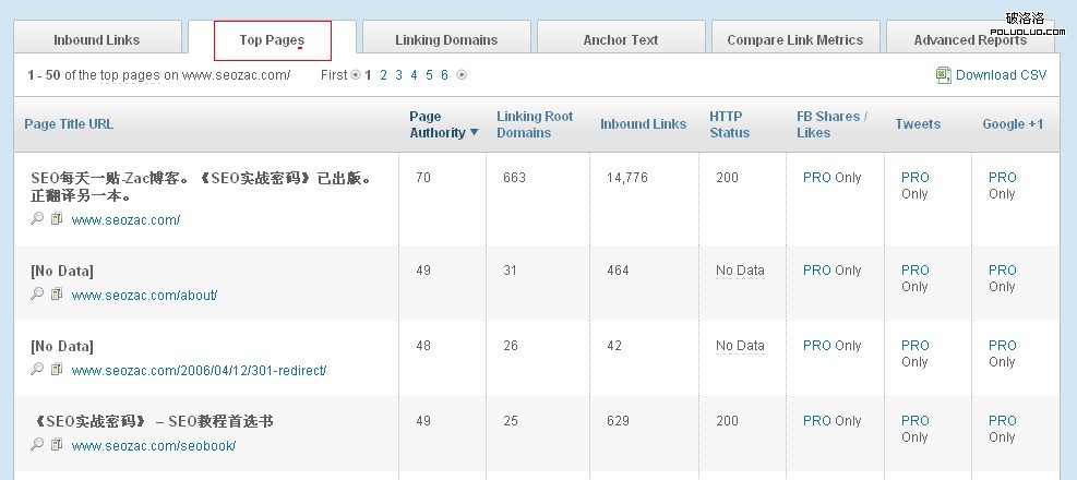 第二個選項卡——Top Pags,這是我們獲知自己網站內頁權重的好工具。通過這個工具我們可以看到各個內頁的權重高低。如果發現了我們想重點推廣的內頁或產品權重低的話,接下來的工作就是重點推廣了。這裡我們分析下ZAC的站,可以看到頁面權重最高的是首頁,第二是關於頁面。頁面的權重值以及外鏈數量也展示了出來。