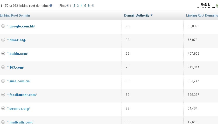 第三個選項卡——Linking Domains,顯示的是包含鏈接的所有域名。這一項對於分析對手也非常重要。外鏈總數高就一定所獲的投票多嗎?不一定,因為一個網站只能給自己投票一次,外鏈總數多不代表外鏈網站數量多。因為一個網站的全站鏈接可能就有幾千幾萬個外鏈,這麼些外鏈只能代表一次投票。這裡外鏈有多少個域名,我們一看便知。這裡我們可以看到zac的外鏈,有google,domz、baidu、163等。