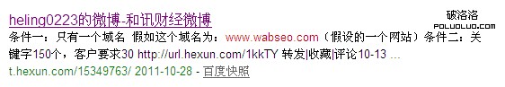 從上面的分析可以得出,微博是可以被百度收錄的,並且可以得到很好的排名(谷歌在之前就已經說明,谷歌已經考慮微博在谷歌搜索結果中的排名)。僅憑這兩點,微博就可以成為seoer者的一套法寶了,但是博石石頭想告訴大家,微博seo遠遠不局限於此,下面我們就繼續看一個例子。