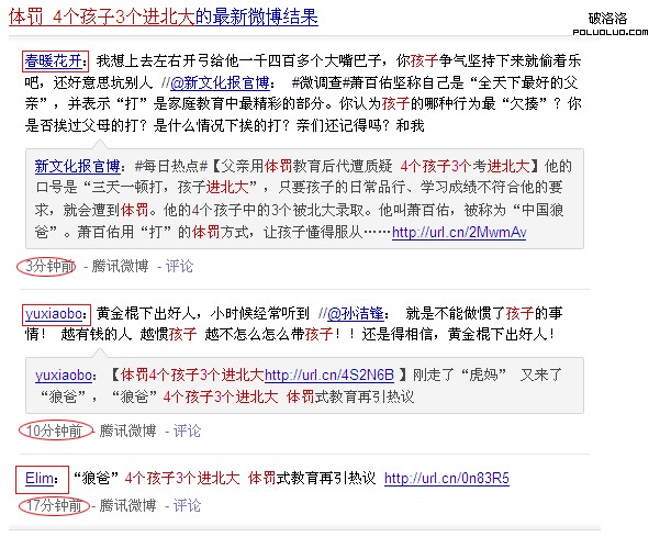 我們在百度搜索框中輸入“體罰 4個孩子3個進北大”,得出下圖信息