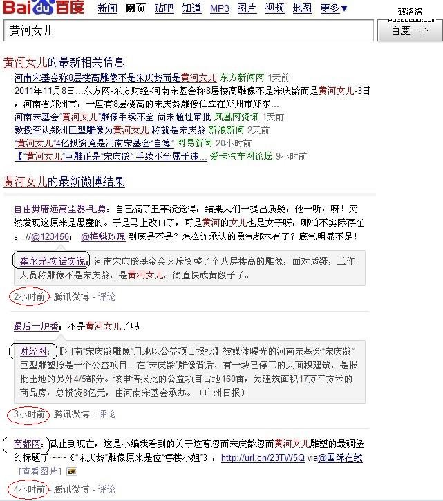 微博微博故名思義即是微形博客之意,微博與博客存在父子般的血緣關系,對博客SEO方法“內容為王,外鏈為皇”兼顧網站內鏈建設這些站長們如數家珍,但是博客SEO的方法能不能平移到微博上的呢?本著實踐出真知的精神,我特意找選了最近網上熱問的事件黃河的女兒,也就是鄭州宋慶玲雕像變身黃河的女兒事件。為什麼網上這麼多事件唯獨選擇這個事件,第一點原因是這個事件夠熱門而高潮剛過去,只有足夠熱門的事才能引起引索引擎高度重視,而高潮剛過看,事後可以清晰地看出誰在裸泳。第二點黃河的女兒可以是一個新生詞,在這些事件之前沒有寫這個詞相關的獨立博客或微博連百度百科也還沒收錄,能杜絕不相關信息的干擾。下面我們在百度框搜一下黃河的女兒,得出下圖信息: