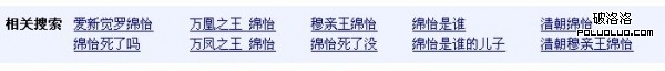 這裡就要靠站長個人的歷史水平和揣摩會員心理會怎麼去搜索。如果真不知道那就問百度吧。以萬凰之王裡的人物為例。搜索 綿怡 (綿怡是萬凰之王裡埋的伏筆,一出來就消失了。) 肯定很多人會都會對這個人好奇。所以我們事先要做好這個人相關關鍵字。那麼大家會怎麼搜索呢。如圖。百度會告訴你。看圖如果你還不知道怎麼選擇關鍵字。那我也沒辦法了