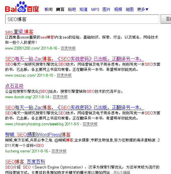 我跟其中的董梁、樂思蜀、徐濤等都換上了鏈接,最後我的SEO博客排名穩步提升到第2頁前面,一直非常穩定,每天也能帶來一點定向的流量,我記得以前我說過這樣一句話,你做某個網站,把這個網站相關關鍵詞排名百度前100的都叫喚鏈接,你排名想不高都難,除非你網站被百度打入了禁宮!還有如果你網站某個關鍵詞停滯不前了,可以考慮聯系到排名比你靠前的交換鏈接。