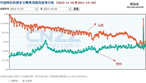 從上圖CNZZ的數據顯示了谷歌和搜狗在過去一年的市場份額。從中可以看出,谷歌失去的市場份額相當的顯著,而搜狗卻在穩步的增長中。搜狗趕超谷歌成為國內第二大搜索引擎已是遲早的事情了。
