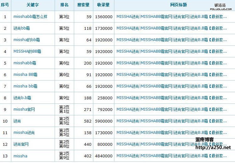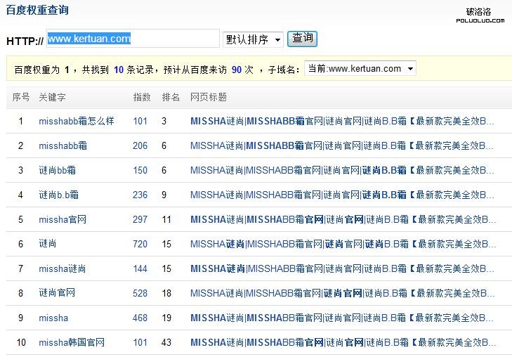 首先,百度權重正如上面所說的,並不是官方確定存在的,而是根據“按來訪數”、“指數大小”、“關鍵詞反向鏈接”等等方面反應的百度權重,先看站長工具查的百度權重和愛站網查的百度權重來訪路徑的圖片,我們看來訪可兒團這個網站的關鍵詞,一共有十個:“misshabb霜怎麼樣”、“misshabb霜”、“謎尚bb霜”、“謎尚b.b霜”、“missha官網”、“謎尚”、“missha謎尚”、“謎尚官網”、“missha”、“missha韓國官網”,分別在百度搜索結果中的排名位置都很不錯,例如是這個關鍵詞“misshabb霜怎麼樣”,一般人如果想知道某品牌BB霜,那麼肯定會搜索“某某品牌的某某產品怎麼樣”,大家看圖,這個長尾關鍵詞“misshabb霜怎麼樣”都能做到百度搜索的第3名;再看其他的關鍵詞“missha官網”、“謎尚官網”,(忘記說了,我沒用過BB霜,百度了一下,“missha”、“謎尚”是某種BB霜的品牌)這個可兒團是個化妝品的團購網,什麼品牌都用,居然能在這個品牌關鍵詞搜索能有這麼好的排名也是不錯的。