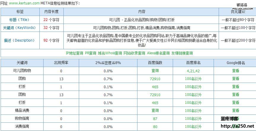 現在我們再來看再來看“可兒團網站的標題、關鍵詞、描述”的圖,個人覺得該網站的關鍵詞做的並不好,每個關鍵詞雖然搜索量多,但是排名都在百名之外,做這樣的關鍵詞並沒有多大用處,還不如做一些長尾關鍵詞,主抓網站幾個賣得火的產品做長尾關鍵。