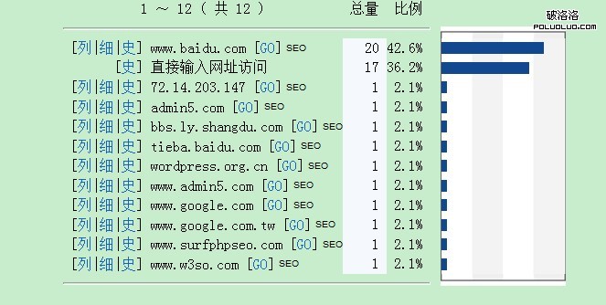 從圖中我們可以看到筆者的站,搜索引擎的來源,百度42.6%,谷歌從谷歌國際和谷歌台灣各來一個合計4.2%,那麼搜索引擎的流量來源站46.8%;直接輸入網址占36.2%;外鏈來源站17%