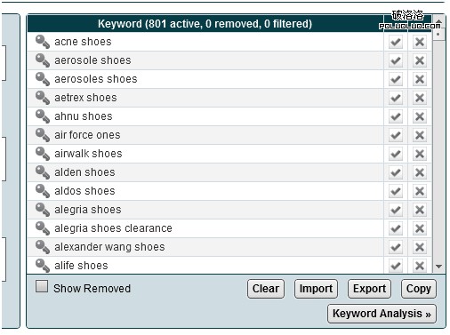 8. 會到關鍵詞分析的頁面,頂部的設置有很多參數,但是我覺得用途都不大,很不精確,我們SEO需要的,僅僅是搜索量就行了。所以把一些沒用的參數去掉,然後點擊”-”號,把那些過濾條件都去掉。最後效果如下圖