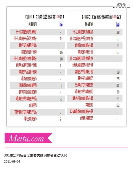 下面是2張排名截圖,圖上看百度排名交替變化,毫無規律可言,後期甚至有權重向B域名集中的“假象”,這也是我認為百度對301處理不靠譜的一點點依據吧。