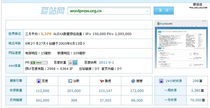 我們這裡選出兩個我比較常去的網站,一個是wordpress中文社區,一個是我們當地的地方論壇(南街論壇),下面是分析出來的兩個論壇相關的seo信息。權重收錄都很不錯。