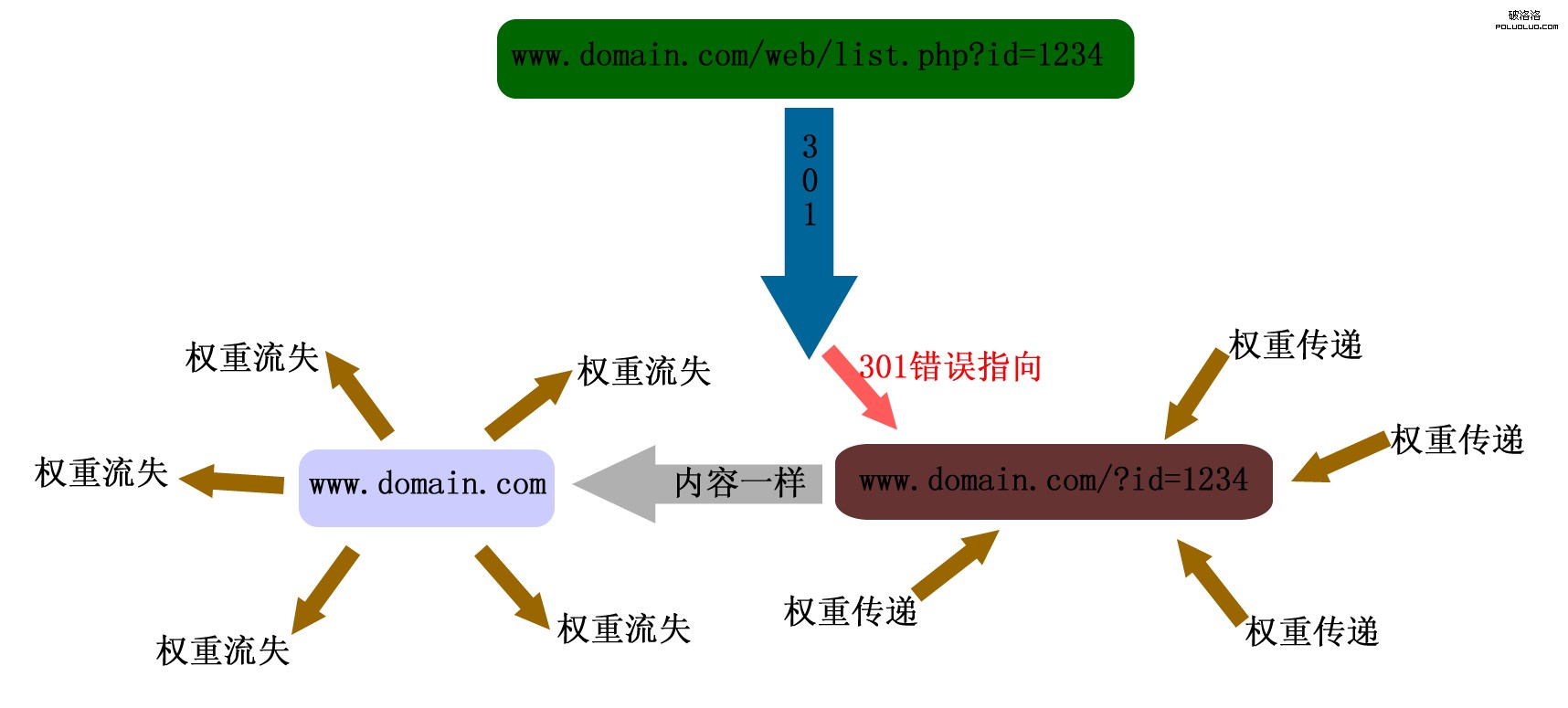 在這種情況下,由於301重定向的設置錯誤,導致創建了一個錯誤的帶參數“/?id=1234”新頁面,而動態頁面中,這樣的首頁和真正首頁是一樣的。這就意味著,首頁每天更新,這新頁面也跟著更新。再試想,如果這個“web”目錄下有N個頁面301重定向至首頁,則意味著創建N個新頁面,換句話說N個首頁,這樣的後果大家不言而喻了。