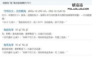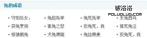 我們看見,成語專題基本采用了字母索引和分組的形式來展現,在“熱門搜索”的位置,還有一類用搜索結果頁的內容,我們仔細看,網站上有兩個“兔的成語”,分別在“熱門搜索”裡和“十二生肖成語裡”。