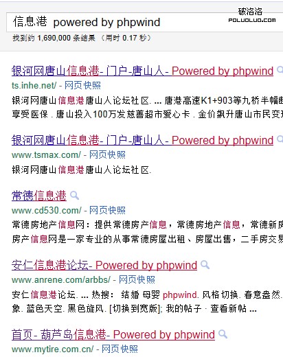 這類論壇如何找呢?我是這樣的:因為地方性論壇都喜歡取名為“XXX信息港”、“xxx網上家園”、“xxx在線”等,而默認的網站標題一般都帶有“powered by phpwind‘ 或 ”Powered by Discuz“ 字眼,只要我們組合下,就可以得到非常多的論壇資源,如下圖就是個例子: